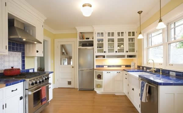L字型厨房设计的两边至少需要1.5米的长度,其特色就是将各项配备依据烹调顺序置于L型的两条轴线上。但为了避免水火太近,造成作业上的不便,在进行家庭装修设计时,最好将冰箱与水槽并排于一直线,而炉具则置于另一轴线。如果想要在烹调上更加便利,可以在L型转角靠墙的一面加装一个置物柜,既可增加收藏物品的容量,也不占用平面空间。