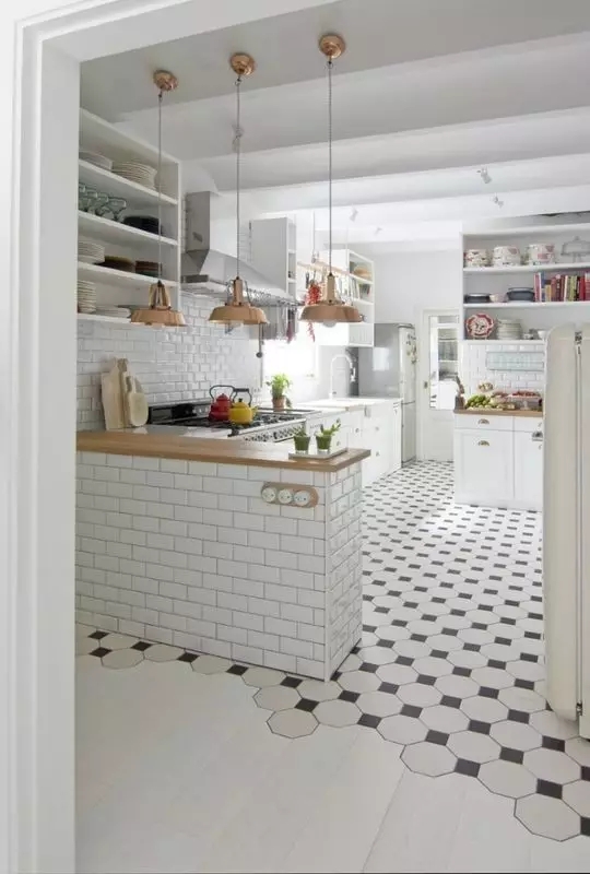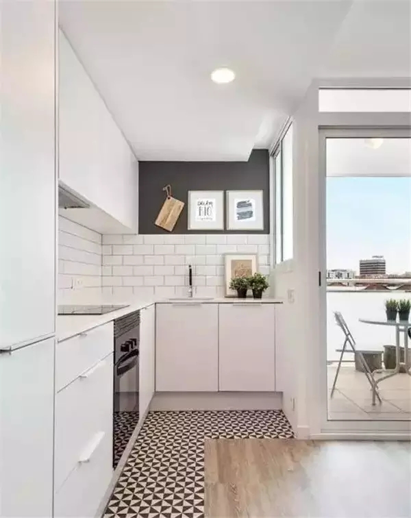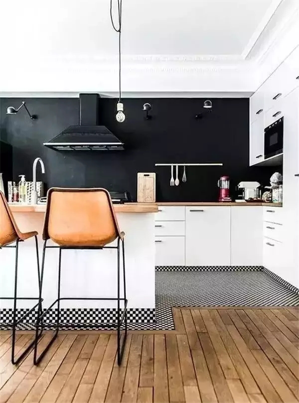 瓷砖+木地板的拼接,在客厅或餐厅沉重的大件家具底下拼接瓷砖代替木地板,能避免对木地板的磨损。或是用地砖来划分厨房的区域,可以避免昂贵的木地板受到厨房用品的侵蚀。