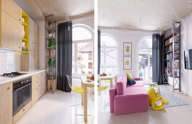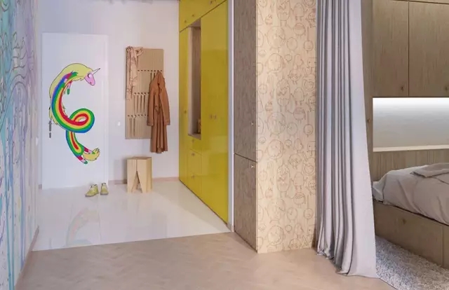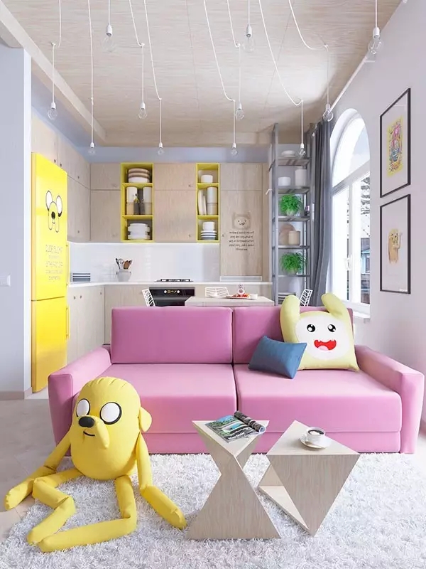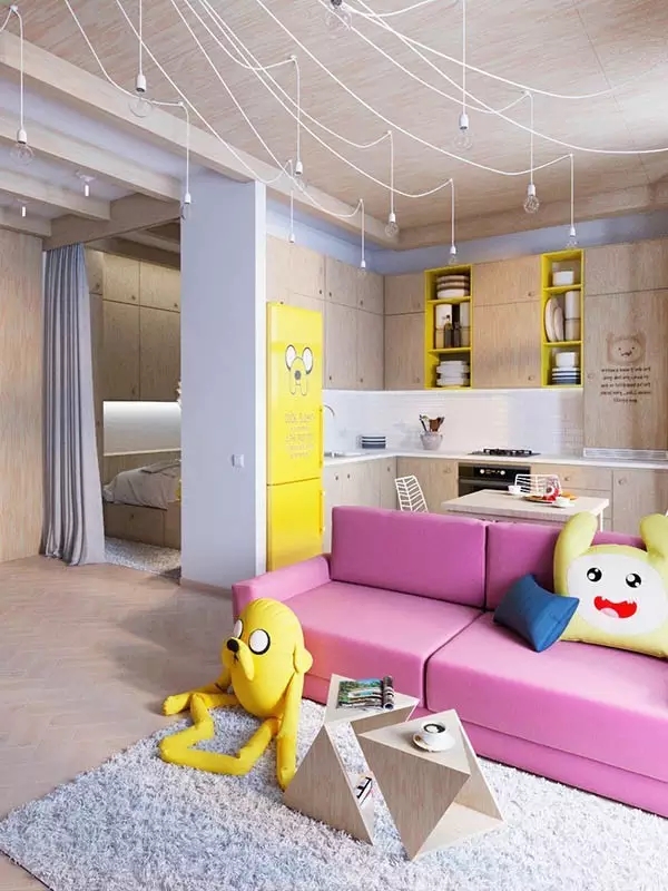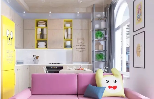 设计师根据户主家里有小孩的情况,就把这套公寓设计成非常适合有小宝宝的,鲜艳色彩的运用非常合理。桃红沙发、黄色冰箱给你眼前一亮的感觉,随处可见的卡通元素让北欧风有了全新变化。