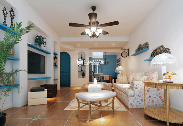 以蓝色、白色、黄色为主色调。再搭配海洋元素,给人以自然浪漫的感觉。造型上,广泛运用拱门和半拱门。家具多是擦漆做旧的风格,搭配贝壳、鹅卵石等,表现出自然清新的家居生活。