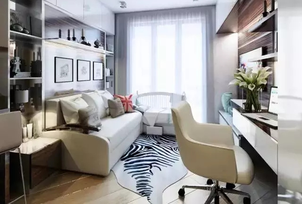 如高脚的单人床和带书架的电脑桌组合,将床面抬高,创造出来的地方就作为小书房,放电脑或其他东西。另外还可以买张折叠床,白天收起当沙发,晚上放下当床铺。
