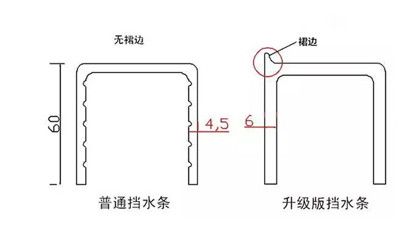 有些卖家吹嘘有裙边的挡水条有多好,实际上是误导消费者。有裙边的挡水条实际上是用在带玻璃的淋浴房下面做石基的,裙边是防止水从玻璃下渗入挡水条。