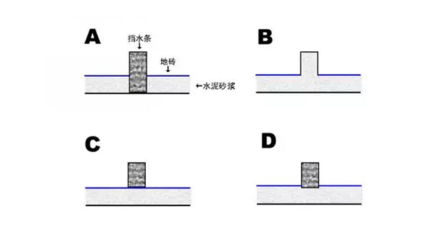 D.水泥砂浆铺好后,铺地砖时留出一条槽再放入挡水条。图解卫生间装挡水条的四种方案