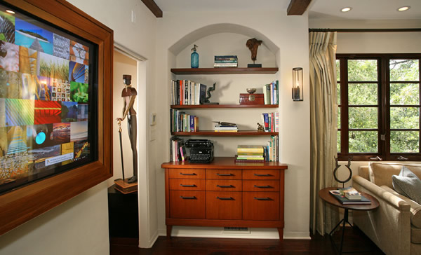 谁说书架一定要是方方正正规规矩矩的呢?斜向的书架要显得有创意得多,安装在电视背景墙上也不会占用太多空间,如果喜欢这样的设计,你也可以试一试哦!