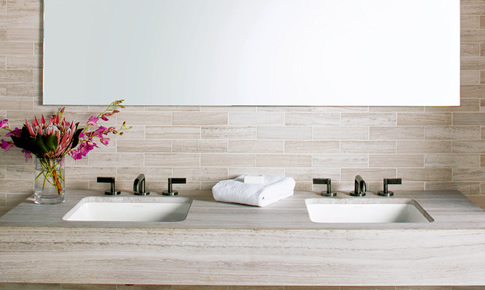 台下盆不仅是更为秀气的一种设计方式,而且也很多变。在女性化的梳洗区,或者简洁大气的梳洗区,只要选对台盆的款式,都能有不俗的表现。双下盆的另一个好处,就是能有效节约空间。对于不够大的洗浴间是制胜法宝。