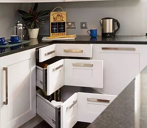 3、不管是L型厨房还是U型厨房,橱柜的转角处让人非常尴尬,所以这种转角拉篮就能够很好的解决问题,转角拉篮可以采取抽屉式、平开式、飞碟式、怪物式等等,对应有不同的功能和使用特点。