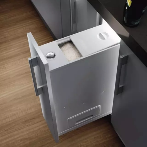 4、相对于以上,米桶拉篮更加实用,就是存放米的一个桶的拉篮,但它有拉门设计,藏于橱柜里面,可以防潮,甚至有些牛逼的米桶拉篮可以定量的流出大米,懒人必备。