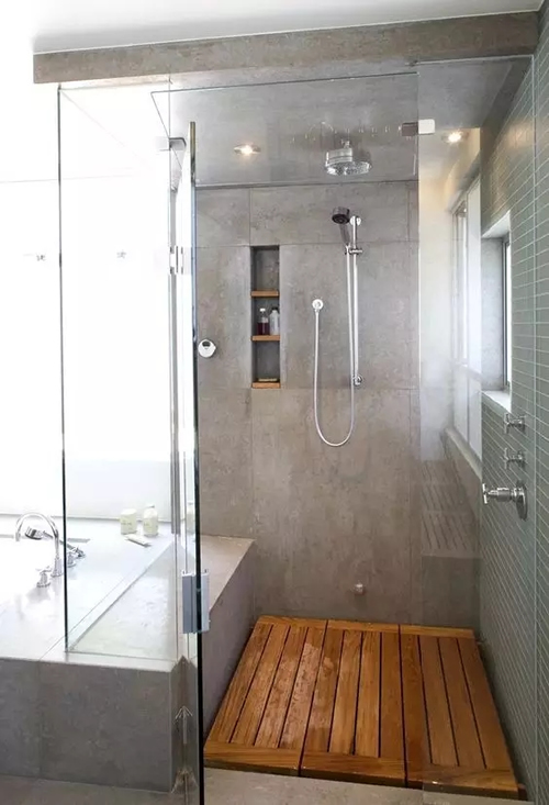 二、淋浴房的防腐木地面最好拆卸方便,考虑到现实情况,防腐木下面免不了要有很多的头发灰尘,直接用水很难清理掉,用手最方便,但是底下有些死角的地方还是无法清理,如果条件允许,可以让专门的人进行清理,所以防腐木地面做成能拆卸的,掀开清理最好。