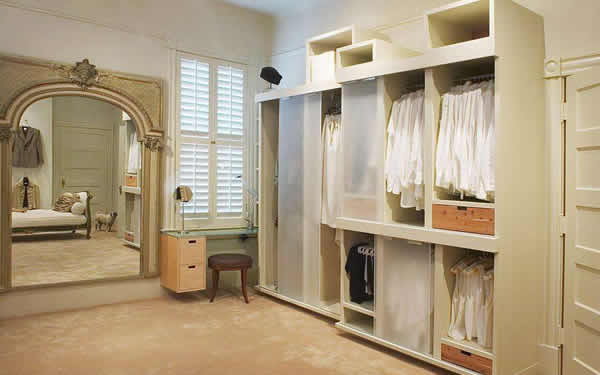 家具可以在外面购买,也可以在装修时整体设计制作,为节省空间,衣帽间最好设计成推拉式,里面的衣橱可以不做门。