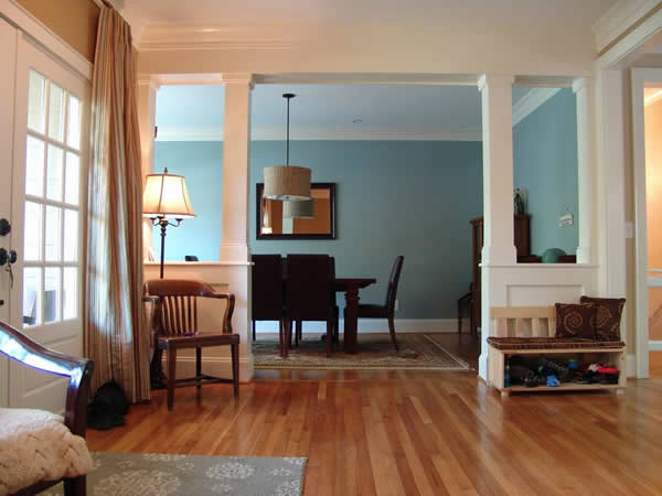 这里的「半墙」概念比较宽泛,不一定是砖砌的墙,吧台、半人高的餐边柜都可以归为此类,特别适用于长窄型的客餐厅区域。