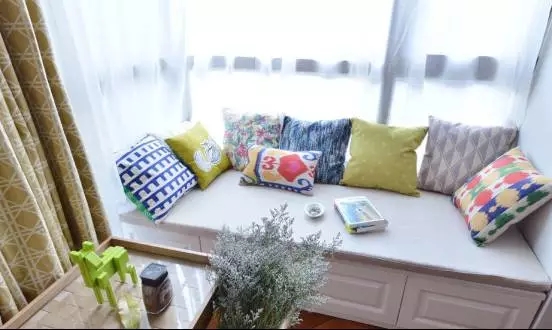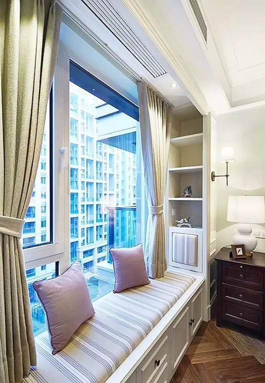 如果窗户离两边墙面还有一定的距离,可以定做一个一体式的储物柜+矮柜,既增加了巨大的储物空间,也更像飘窗的样子。
