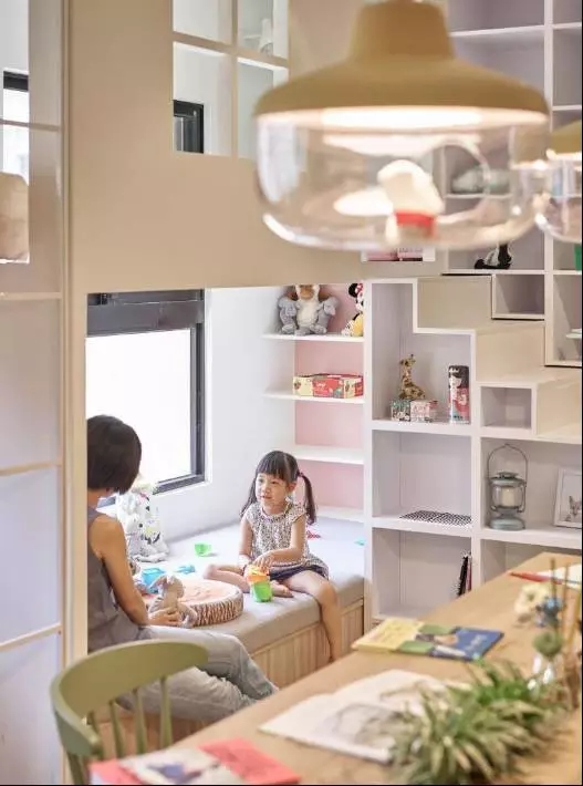 也可以作为一个儿童游戏区,旁边的置物柜放些孩子的童书、玩具,平时在这里陪孩子做做游戏,也能增长彼此的感情。
