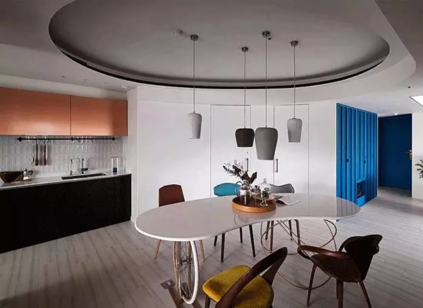 对应餐桌的圆弧形,设计师将吊顶打造成圆形,并选择类似的圆弧状吊灯,使原本空荡荡的天花板不再单调。