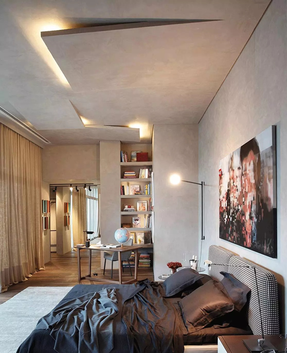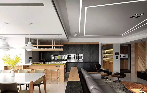 想用吊顶凹造型,可塑性极强的石膏板是上佳选择。不规则的形状堆积、几何感强烈的装饰手法,让墙体、空间不再是冰冷扁平,真正让室内环境从头顶到地面成为相得益彰的整体。