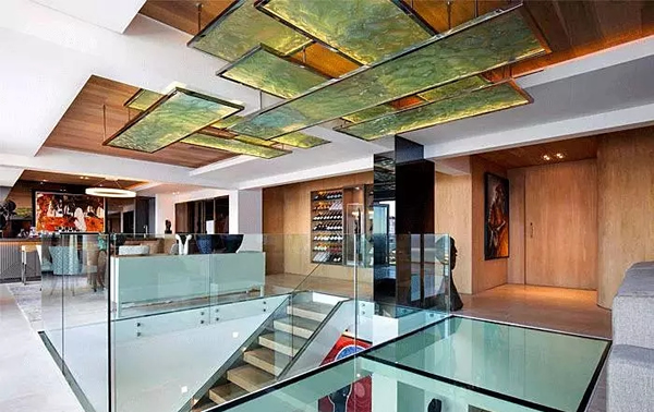 配合底部玻璃面,设计师不仅在吊顶设计中延续相同材质,更以彩色玻璃提亮了环境色。黄绿色调和整体氛围统一。