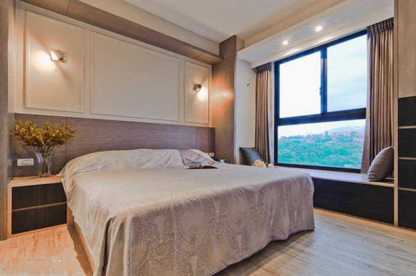 6.床头灯和台灯的选择。最好选择可调节亮度的,即使看书也不会影响到另一半休息。灯罩的材质柔和。水晶灯或者透明玻璃灯罩的台灯,虽然好看,但过于刺眼的光线无论对阅读或是夜里起身,眼球适应度都不太好。最好选磨砂玻璃、布面、贝壳等能使光线柔和的灯罩。灯头高于枕头,让光线从45度倾斜散布下来,更适合看书。