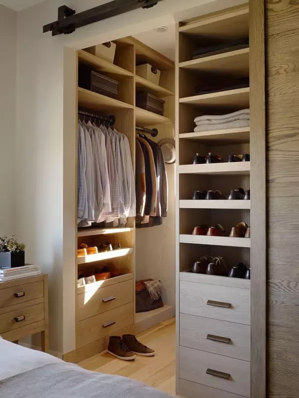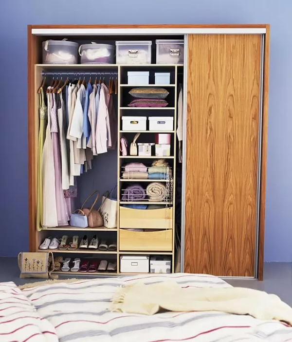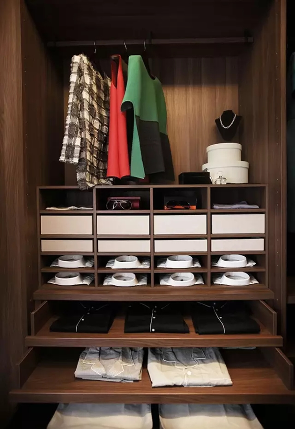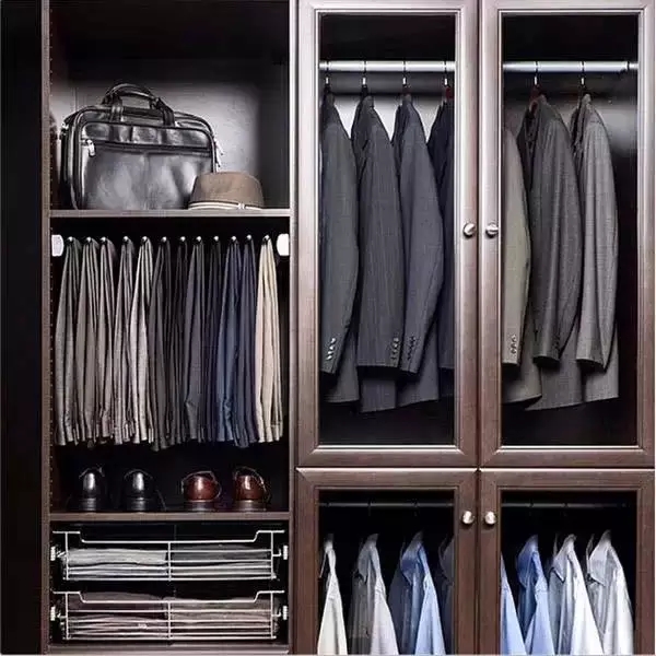 挂衣服的区域要有长短区分,冬天的衣服肯定有长的,挂短衣服的区域下面可以配合抽屉或隔板使用
