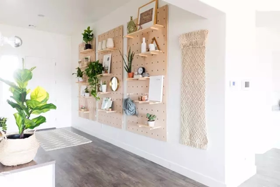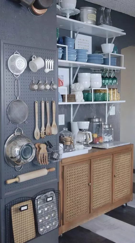 如果说有另外一样东西能与铁艺网格相媲美,那只能是洞洞板了,英文名为Pegboard。在国外它的使用可是非常流行的,因为它不仅仅是装饰,更是一件收纳神器。有了它,任何小物件只要挂上小铁勾就能上墙,让你的桌面立刻整洁如新。小编也有专门发过一篇关于洞洞板的强收纳文章。