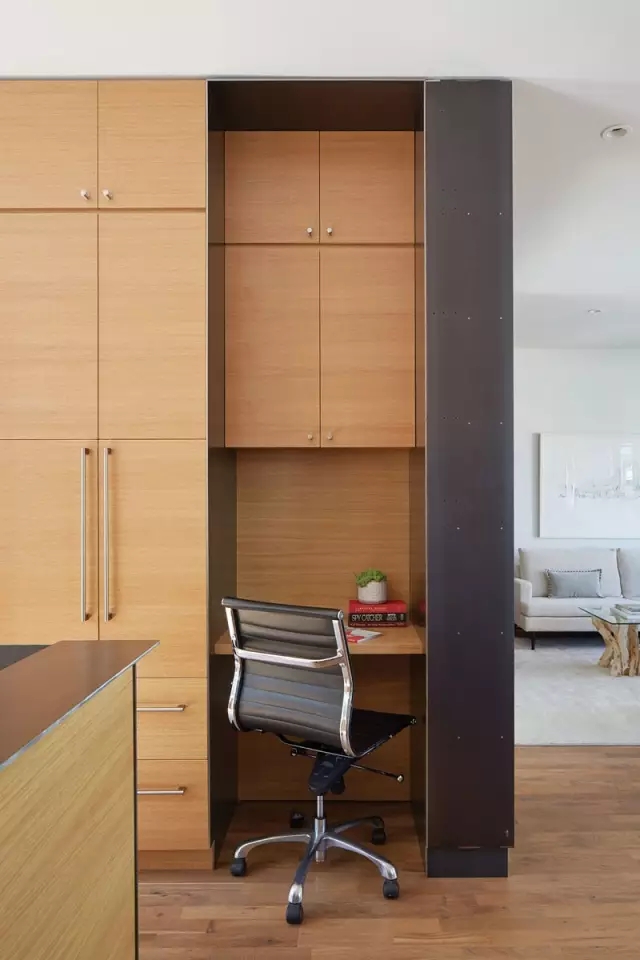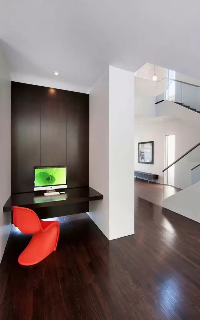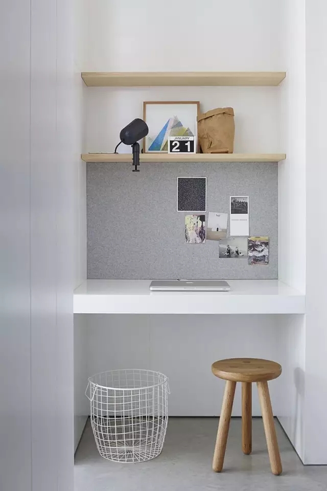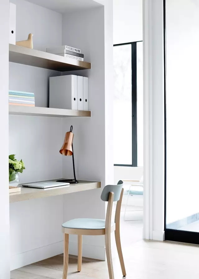 4.在两个墙面之间嵌入一个简单的桌面,毫不费力就创建了一个理想的办公空间。