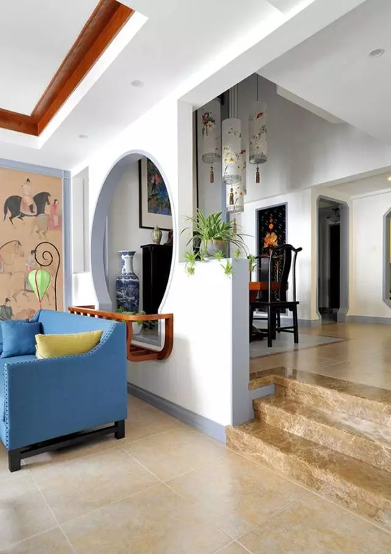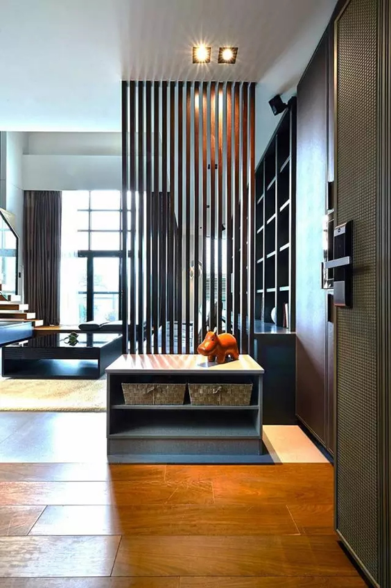 木隔栅一般在中式、日式、东南亚等风格中比较常用,以木格子雕花或竖条纹为主,简洁温馨,有一种回归大自然的感觉,很舒适。