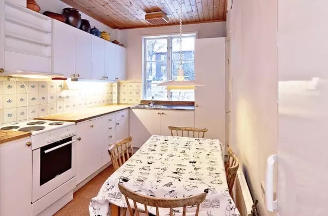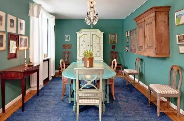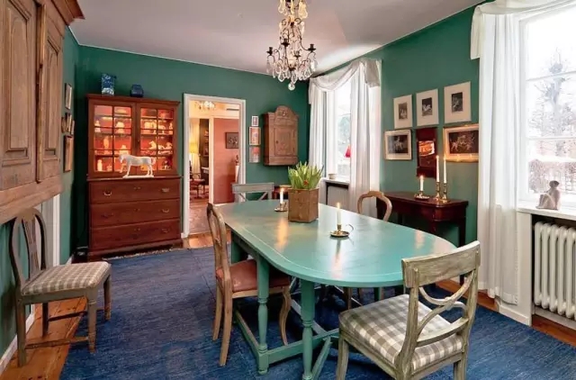 用了深色系的蓝绿色做为客餐厅的主色,大面积深色系墙面通常会让人觉得有压迫感,但只要光源设计得好再搭配老旧质感的家具会让人产生一种身在欧洲小镇的感觉。