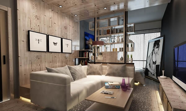 在规划好各个功能区后,不喜欢完全开放的朋友就要考虑隔断的使用。非loft可使用一个展示柜将会客区与休息区隔断开来,这样避免客人一来就看到了床铺,很好的保护了隐私空间。