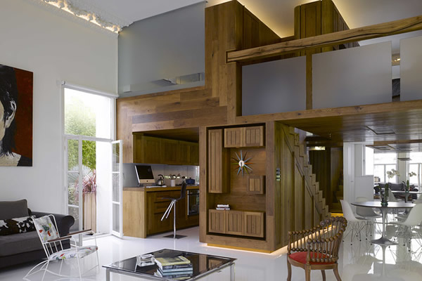 Loft层高在3.6-5.2米左右,加上上下隔断的原因,应选用较矮&造型简单的柜子,楼梯的台阶也可做成一个个的小柜子,便于收纳各种零散物品。