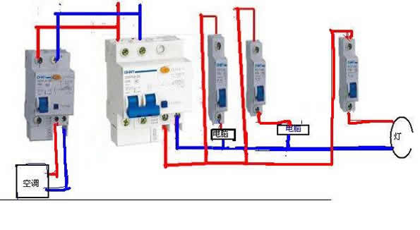 第二种:使用普通2P空气开关作为总开关,除照明与空调使用1P空气开关外,插座均使用带有漏电保护的空气开关!