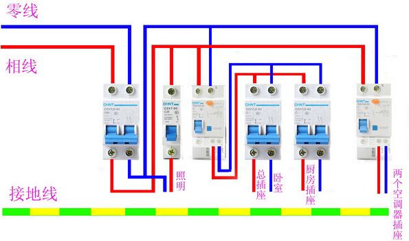 第一种:使用带有漏电保护的空气开关作为总开关,不管是照明/普通插座/厨卫插座/空调插座,都是使用1P空气开关!