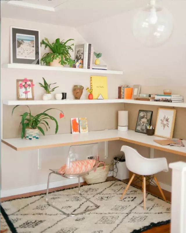 建造这样的工作区会需要大一点的空间,但对比起专门的书房来说,整个成本真的会低很多,而且整齐利落,即是灵感当中提到的置物展示空间,又可以玩电脑、做功课和工作,挂墙式的桌面和搁板置物架简洁而且价格亲民,再配张地毯,整个位置立刻就亮眼了起来。