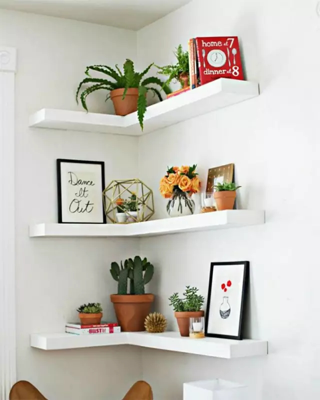 像上图这样安装几层转交式的置物架是个不错的主意。简单放上鲜花绿植、画作和小装饰就已经很漂亮,当然,你还可以用来放书,或者漂亮的餐具。不过在放的时候一定要考虑到置物架的承重能力,以免发生意外。