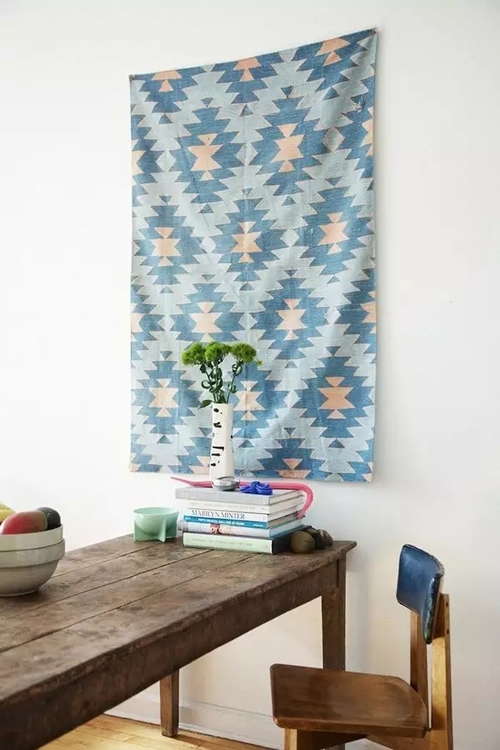 作为软装必不可少的一部分,纺织品不但可以作为窗帘、床品、地毯、抱枕,也可以挑选比较有特点、跟房间其他纺织品能够呼应(颜色、纹理或材质)的挂上墙,缓冲下墙面结构的坚硬感觉。