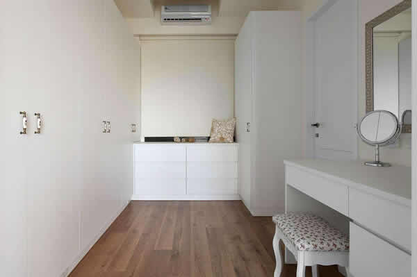 家具可以在外面购买,也可以在装修时整体设计制作,为节省空间,衣帽间最好设计成推拉式,里面的衣橱可以不做门。