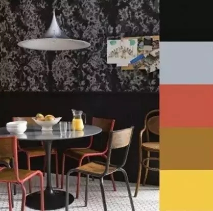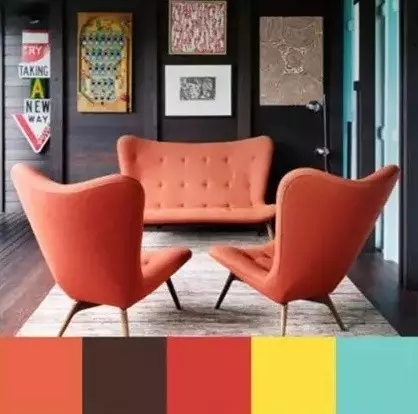 2.咖啡色配米色、鹅黄、砖红、蓝绿色、黑色。