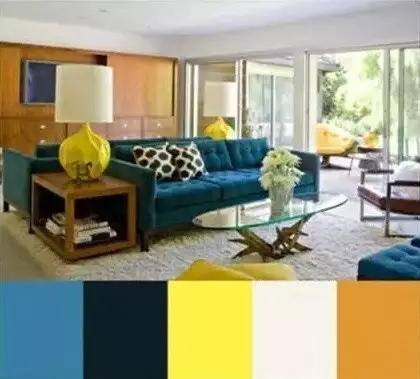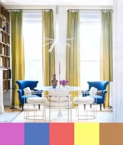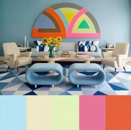 多种颜色的搭配下一定要选好主色调,然后大面积的使用,就不会显得房间凌乱,例如上图的蓝色、黄色、粉色的沙发一样。