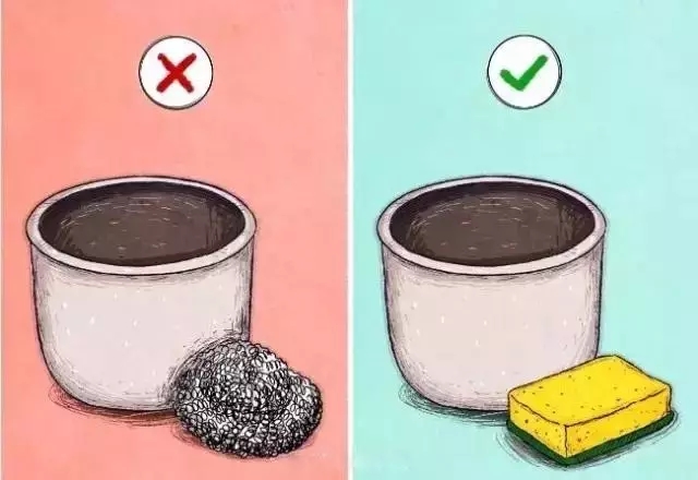 洗锅时,一定要用海绵柔软的抹布擦拭,切忌不要用钢丝球擦洗,以免伤害锅的内外壁。