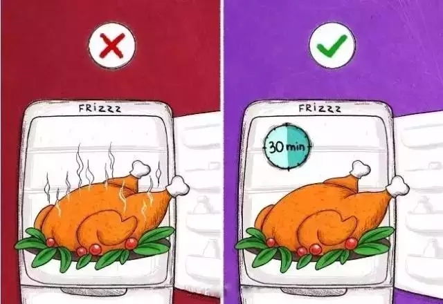 1.不要把热的食物立即放入冰箱,一定要让它们温度降下来再放进去。