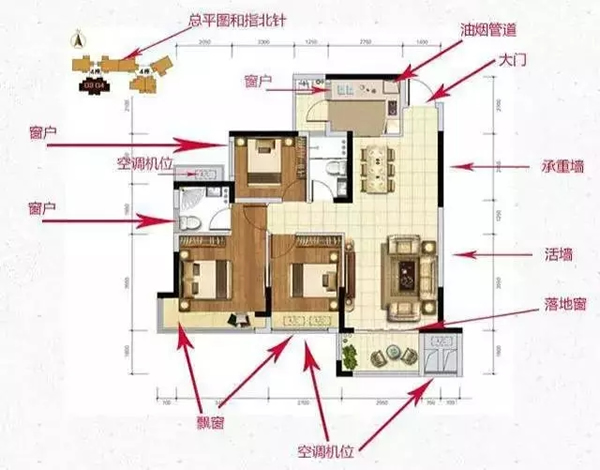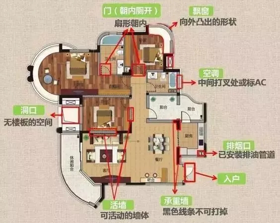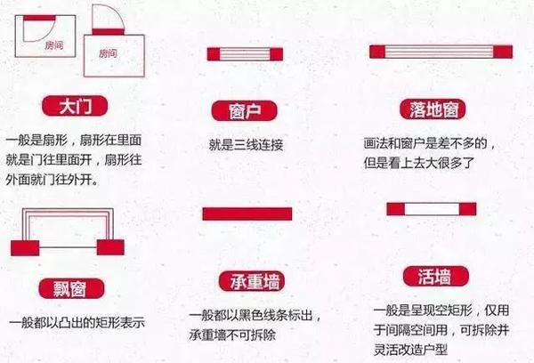 户型图上有各种小图标,就像我们开车有固定的道路标识,户型图上也有通用的标识,衣柜、油烟管道都有固定的标识。了解了这些标识,你就不会再傻傻的去问设计师“哎,哪里是才窗户啊?哪里是承重墙啊?”当然也会更加了解自家户型图。