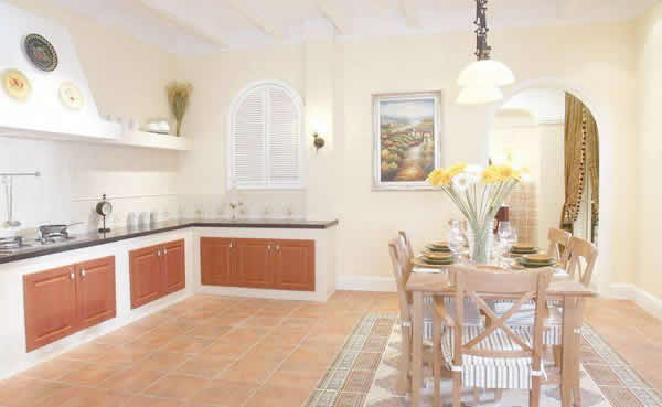 以一套仿古瓷砖做出的橱柜为例,柜体表面与台面粘贴11.5cm×11.5cm规格的仿古瓷砖,抽屉、门板使用经过作旧处理的橡木、樱桃木、胡桃木等别墅装修常用木材,根据主人的喜好,选择或深色、或浅色,或横切、或竖切的质感与纹理,与跳色的瓷砖搭配在一起,粗犷却不失品位,大气又亲切自然。