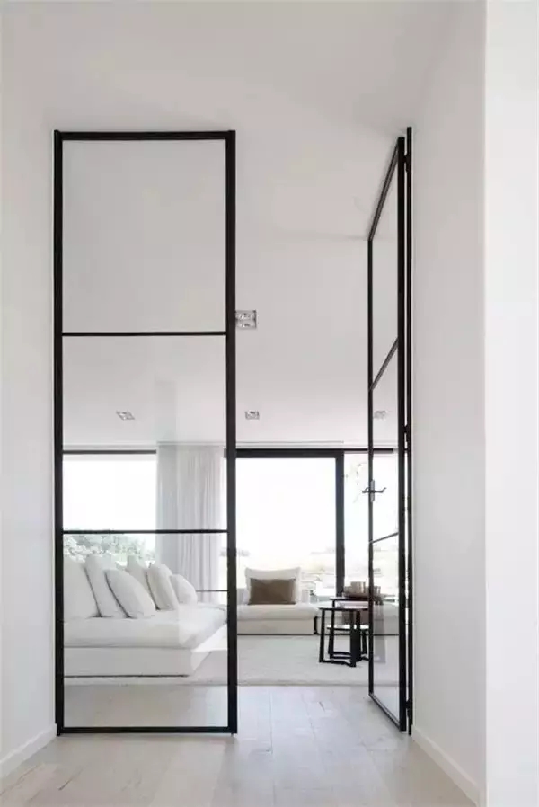 如果不是特别强调隐私的场所,比如客厅,可以选择铁框玻璃门代替常用门。