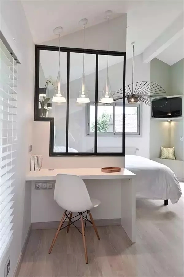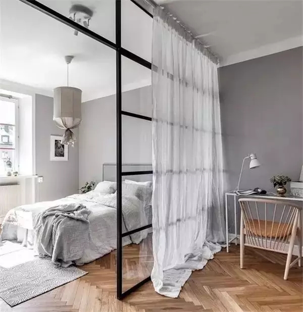单间的小户型用玻璃铁框做隔断,省了一面墙占据的空间,房子不会显得特别拥挤。