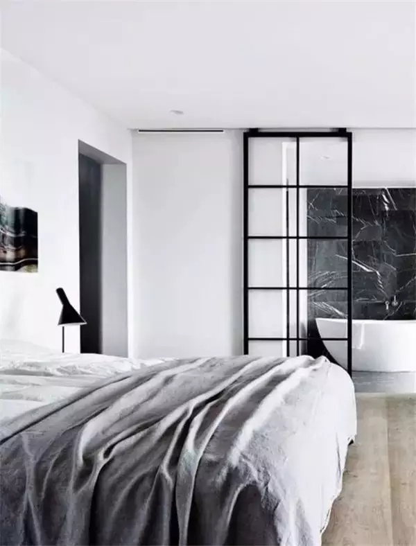 卧室用玻璃门或隔断,用来分割卧室与卫生间或者书房工作区。