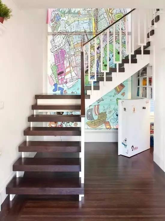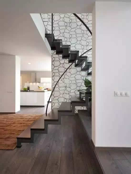 复式楼中楼梯作为一种不可或缺的空间连接,却总是遗憾的被放在角落,吃饭洗澡回房间,上班下班,进进出出,路过楼梯从不会多做片刻停留,这是在怪它美丽的不够过分吗,那么用壁纸吧。