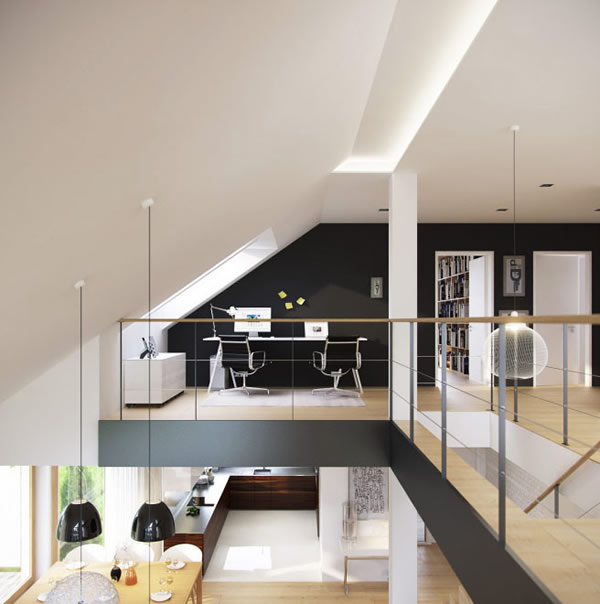 简约大方的空间氛围,安稳的隐藏在倾斜屋顶的下方,这个夹层设计很适合 SOHO 族,夹层的超薄穿透的栏杆,整体设计都是采用开放式设计,可让自然光透入家中的每个角落,利落的线条呈现简约时尚风格。