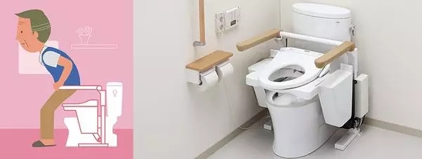 传统马桶较低,老人站立起较费力,所以可以用辅高坐垫来增加5cm马桶的高度,另外马桶两侧的把手使得老人如厕时有支力点。