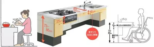 另外,能坐下来工作的厨房装修也是非常值得推荐的。若为高龄人士(腿脚不便需轮椅老人)则操作台根据使用者腿部情况高度+18cm=约73~85厘米左右。