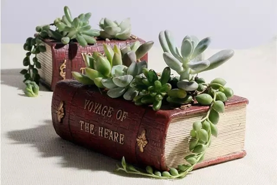 摆放在书桌前最好选择透气的石质花盆,不但可以让多肉茁壮成长还能打造出令人倍感舒适的小清新书桌。此外,还可以将花盆做成书籍的样子,摆在书桌上也是别有情趣。