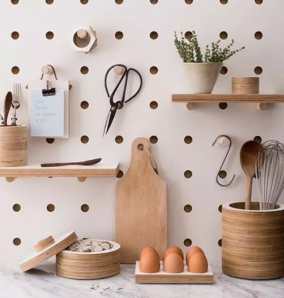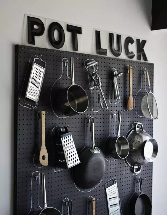 厨房绝对是东东板的用武之地,各式各样的锅铲瓢盆,都能一一被安放在洞洞板上。