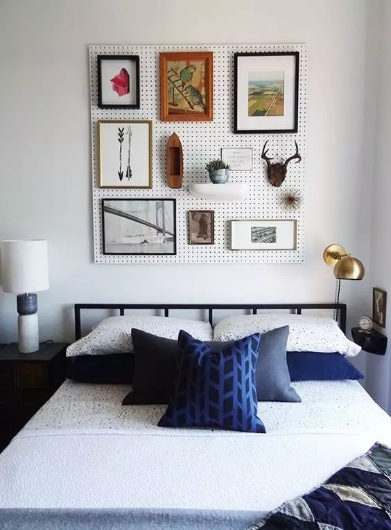 卧室里安一块洞洞板,可以挂一些画作和一些装饰品,既不用在墙壁上四处打洞,还可以规范东西的悬挂位置,避免杂乱无章。