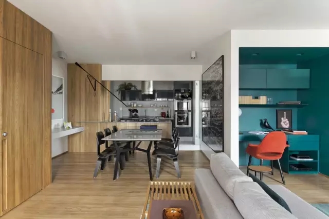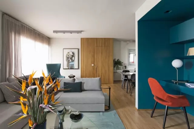客厅的地板和部分橱柜选用了低调的浅橡木色,搭配上孔雀蓝的工作区和家具,增添高雅格调的同时也丰富了空间的色彩。